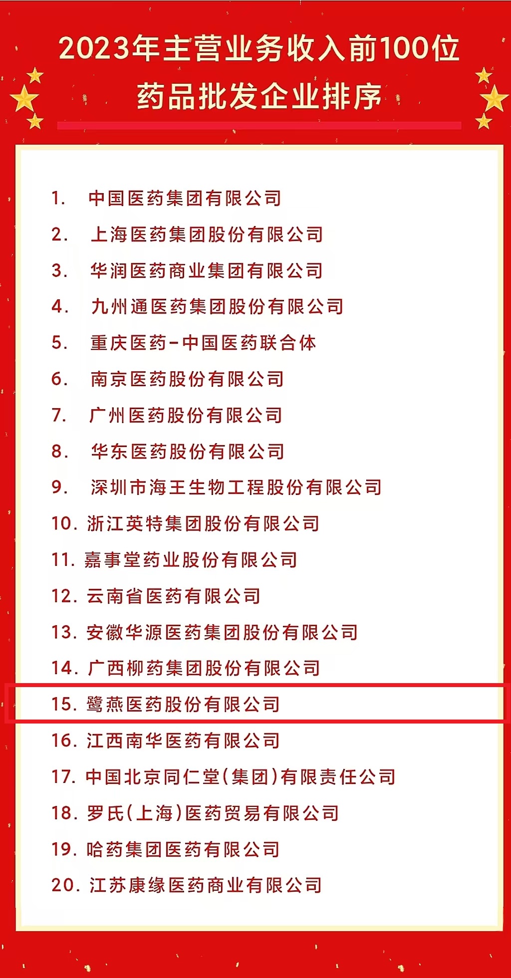 鷺燕醫(yī)藥榮登2023年藥品批發(fā)企業(yè)主營(yíng)業(yè)務(wù)收入第15位!