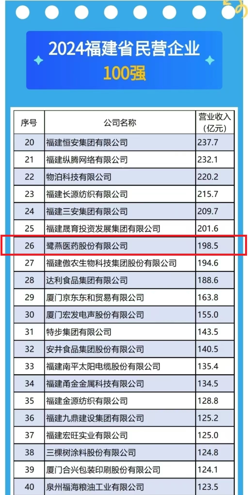 本月,福建省工商聯(lián)發(fā)布2024福建省民營企業(yè)100強、制造業(yè)民營企業(yè)100強、服務(wù)業(yè)民營企業(yè)100強、創(chuàng)新型民營企業(yè)100強和民營企業(yè)社會責(zé)任100佳5個榜單。鷺燕醫(yī)藥榮獲2024福建省民營企業(yè)100強第26位、福建省服務(wù)業(yè)民營企業(yè)100強第10位、福建民營企業(yè)社會責(zé)任100佳!