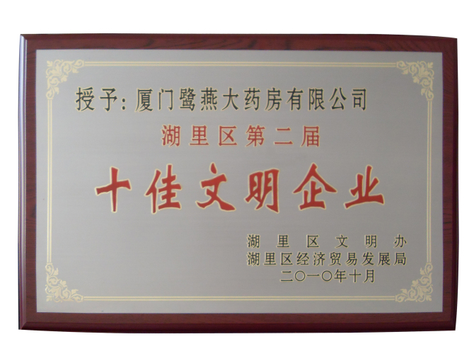 廈門鷺燕大藥房有限公司于2010年10月被廈門市湖里區(qū)文明辦、廈門市湖里區(qū)經(jīng)濟(jì)貿(mào)易發(fā)展局評為湖里區(qū)第二屆“十佳文明企業(yè)“榮譽稱號。