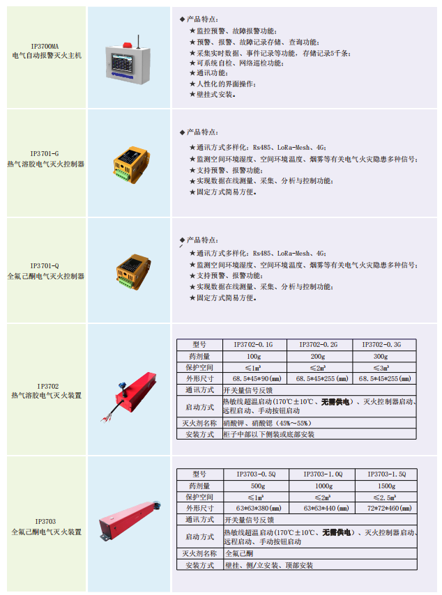 IP3703全氟己酮電氣滅火裝置是新型環(huán)保、高科技、綠色消防產(chǎn)品,是內(nèi)置于儲(chǔ)能電池簇、配電柜、高壓開(kāi)關(guān)柜、精密機(jī)房配電柜等場(chǎng)景的自動(dòng)滅火裝置,可通過(guò)自帶的溫度敏感元件啟動(dòng),也可通過(guò)電氣滅火系統(tǒng)電信號(hào)觸發(fā)啟動(dòng)。產(chǎn)品采用絕緣、環(huán)保的全氟已酮滅火藥劑,具有無(wú)色、無(wú)味、無(wú)毒、不導(dǎo)電等特點(diǎn),不會(huì)對(duì)被保護(hù)設(shè)備造成二次傷害。同時(shí),該裝置采用先進(jìn)的密封技術(shù)和自動(dòng)控制技術(shù),能夠保證長(zhǎng)年不泄漏,實(shí)現(xiàn)快速響應(yīng)和精準(zhǔn)滅火,可有效撲滅電芯熱失控引發(fā)的早期鋰電池火災(zāi),并起到對(duì)保護(hù)區(qū)域?qū)崿F(xiàn)快速降溫和持續(xù)抑制復(fù)燃的作用。全氟己酮滅火劑具有良好的滅火效果,其機(jī)理是通過(guò)物理和化學(xué)兩方面的作用滅火,全氟己酮液體高速霧化噴出后,遇熱氣化,由于氣化熱容量大,具有較強(qiáng)的吸熱能力,使火焰快速失去熱量,全氟己酮比重大,在懸浮下落的過(guò)程中,火焰周邊可以隔絕空氣中的氧氣,可以捕捉燃燒鏈?zhǔn)椒磻?yīng)的自由基,終止火焰?zhèn)鞑サ逆準(zhǔn)椒磻?yīng)。全氟己酮滅火裝置具有滅火效率高、環(huán)保潔凈、使用安全、絕緣性能好、對(duì)電子精密設(shè)備無(wú)損傷等綜合優(yōu)勢(shì),可撲救A、B、C、E各類(lèi)火災(zāi),應(yīng)用于全區(qū)域或局部區(qū)域滅火,尤其適用于車(chē)輛電控柜、精密設(shè)備、精密機(jī)房配電柜、有人工作但又較為封閉的場(chǎng)所。