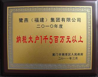 由廈門市湖里區(qū)政府舉辦的 “湖里區(qū)2010年度納稅先進(jìn)企業(yè)”的評(píng)選名單已經(jīng)正式揭曉,鷺燕(福建)集團(tuán)有限公司榜上有名,獲得了 “湖里區(qū)2010年度納稅大戶1千5百萬元以上先進(jìn)企業(yè)”的榮譽(yù)稱號(hào)。自2007年底搬遷至湖里區(qū)以來,我司已連續(xù)三年獲此榮譽(yù)稱號(hào)。