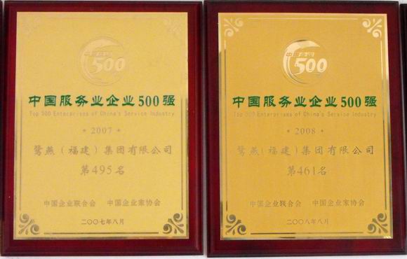 鷺燕集團(tuán)又傳捷報,在榮獲了“市百強(qiáng)企業(yè)”、“市重點民營企業(yè)”、“湖里區(qū)十佳文明企業(yè)”之后,再次榮獲“中國服務(wù)企業(yè)500強(qiáng)”稱號,這已是鷺燕集團(tuán)連續(xù)三年獲此殊榮。