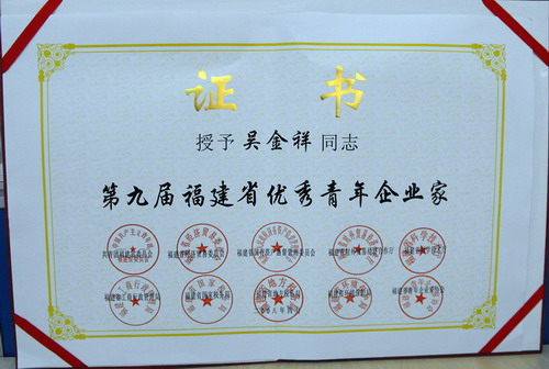 [喜訊] 日前,由共青團福建省委員會、福建省經濟貿易委員會、福建省國有資產監(jiān)督管理委員會、福建省對外貿易經濟合作廳、福建省科學技術廳、福建省工商行政管理局、福建省國家稅務局、福建省地方稅務局、福建省環(huán)境保護局、福建省青年企業(yè)家協(xié)會共同主辦的“第九屆福建省優(yōu)秀青年企業(yè)家”評選活動揭曉,鷺燕集團董事長兼總裁---吳金祥先生榮獲“福建省優(yōu)秀青年企業(yè)家”榮譽稱號!