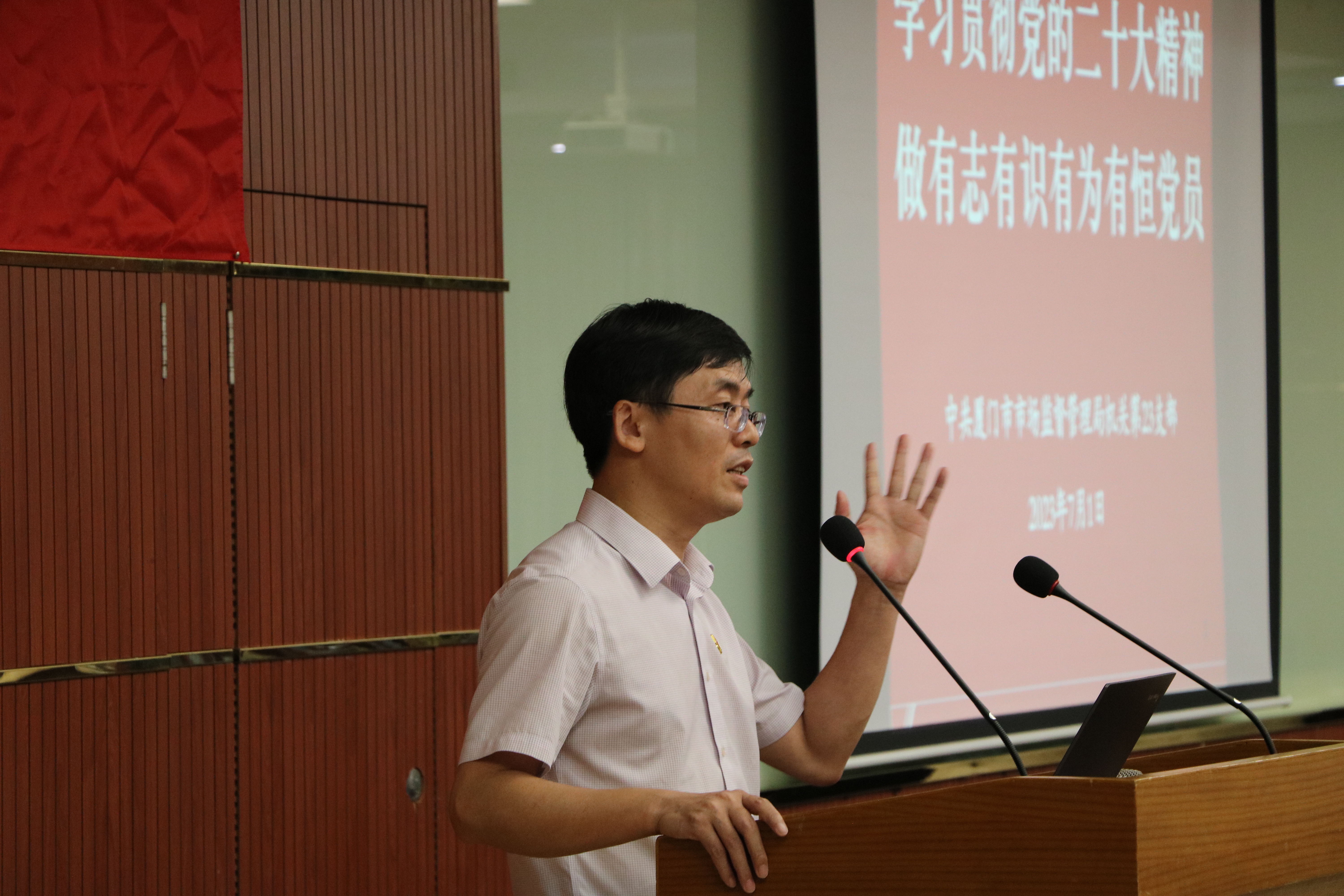 在這次聯(lián)建共建中,中共廈門市市場監(jiān)督管理局機(jī)關(guān)第二十三支部何清杭書記帶來了一堂《學(xué)習(xí)貫徹黨的二十大精神,做有志有識有為有恒黨員》的主題黨課。授課前,何書記作為領(lǐng)誓員,脫稿帶領(lǐng)大家一起重溫入黨誓詞,全體黨員面對鮮紅的黨旗,莊嚴(yán)地舉起右拳,鏗鏘有力、擲地有聲地宣讀誓詞。