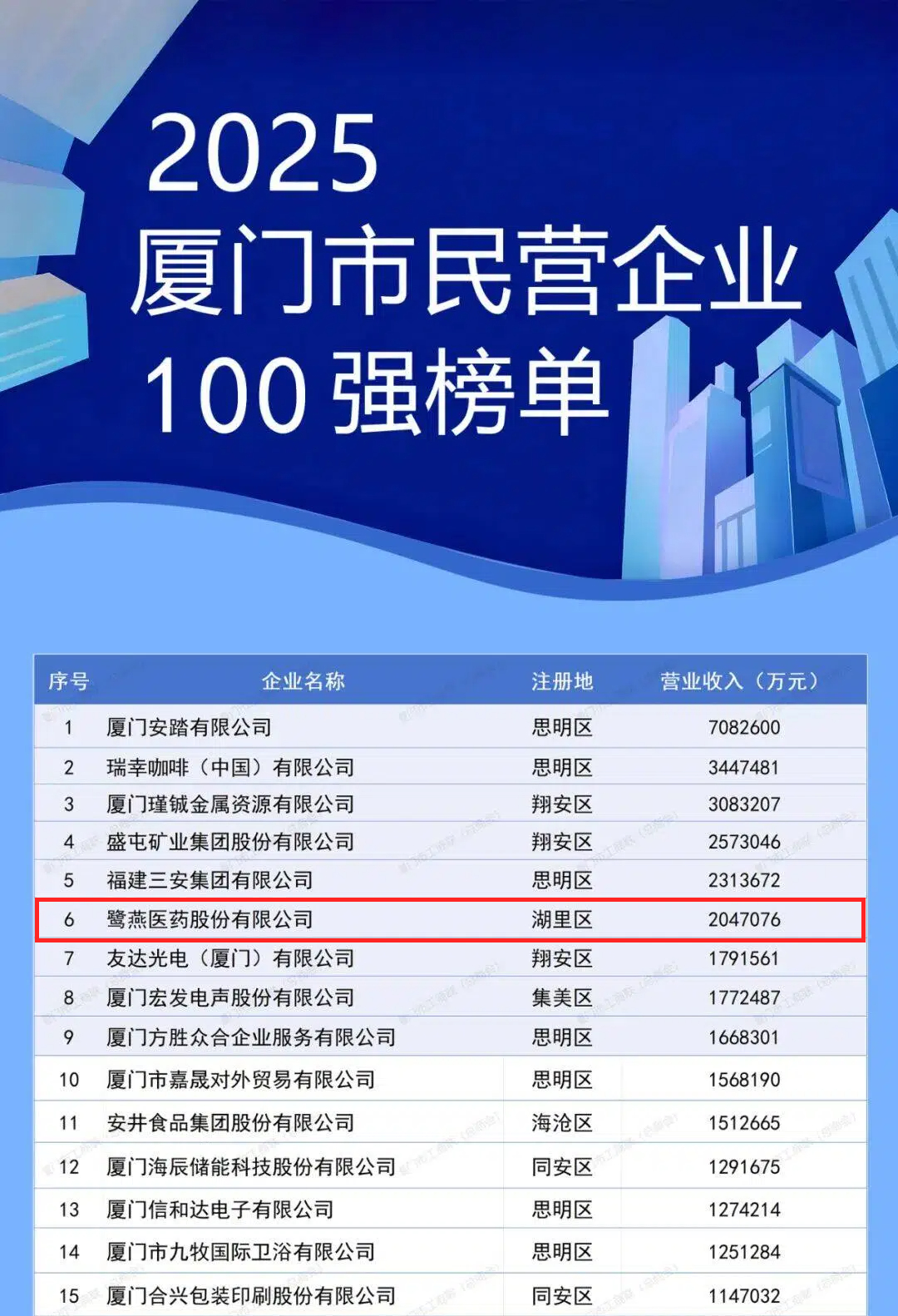 11月1日上午,2025年廈門(mén)企業(yè)家日大會(huì)召開(kāi)。大會(huì)發(fā)布了2025廈門(mén)市民營(yíng)企業(yè)100強(qiáng)系列榜單,介紹了廈門(mén)市民營(yíng)經(jīng)濟(jì)發(fā)展態(tài)勢(shì)和營(yíng)商環(huán)境建設(shè)成效。鷺燕醫(yī)藥股份有限公司憑借上市企業(yè)綜合實(shí)力,榮膺“2025廈門(mén)市民營(yíng)企業(yè)100強(qiáng)”第6位,以及“2025廈門(mén)市民營(yíng)企業(yè)服務(wù)業(yè)50強(qiáng)”第4位。
