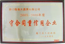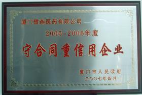 經(jīng)過(guò)層層選拔、評(píng)審,廈門鷺燕醫(yī)藥有限公司和廈門鷺燕大藥房有限公司雙雙榮獲了“2005-2006年度守合同重信用企業(yè)”稱號(hào),這是政府權(quán)威部門對(duì)我集團(tuán)合同管理工作的充分肯定。